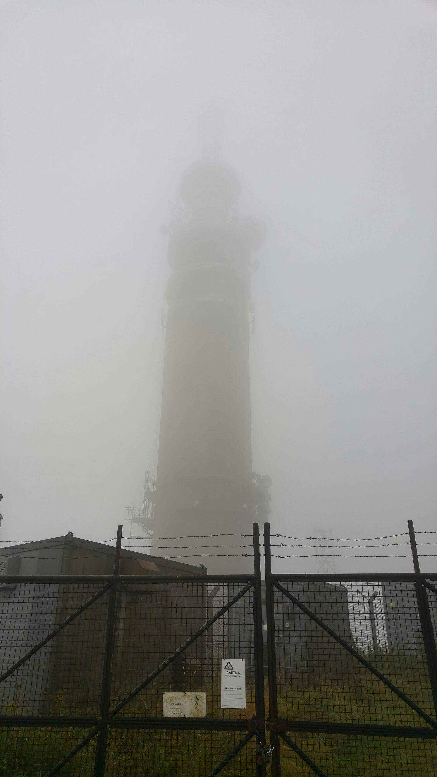 I get out my tablet with my OS map on it, hoping it will hold out in the rain for long enough to show me where to go, and I see that I need to follow a path southeast which then branches southwest and I’ll be there. Splashing directly through massive puddles – why bother going around when you’re already soaked? – I finally make it to the gates of the transmitter’s compound and… I still can’t really see it – there’s a sort of detectable darkening vertical line through the fog. That’s it. I try and do a quick video of myself being there and hurry off downhill.